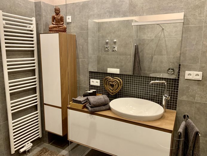 Hochwertige Ausstattung voll saniert mit schönem Bad hochwertiger Badausstattung wie bodentiefer Dusche, in der Wohnung sind Einbauschränke vom Tischler angefertigt für Garderobe, Waschmaschine Reinigungsmittel und Kleiderschrank. In der gesamten Decke ist ein Lichtsystem verbaut. Die Wohnung wurde zusätzlich innen gedämmt. Ein grosser Balkon zum verweilen ist vorhanden, gerne ansehen es lohnt sich !