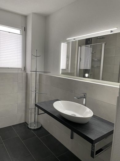 Moderne Fliesen im Bad, Gäste-WC und in der Küche – pflegeleicht und zeitlos elegant.