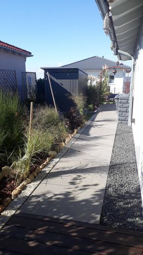 Die Platten ums Haus sind 1 qm groß und mit Grenzsteinen abgefasst.