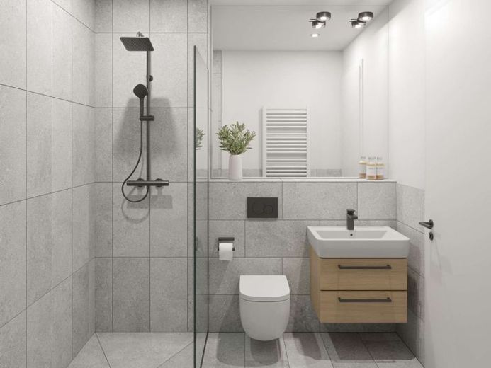Der offene Wohnbereich mit integrierter Küchenzeile bildet das Herzstück der Wohnung und öffnet sich über bodentiefe Fenster auf die gemütliche Loggia, die sowohl vom Wohnzimmer als auch vom Schlafzimmer aus zugänglich ist – perfekt, um den Tag mit einem Kaffee im Freien zu beginnen oder den Abend entspannt ausklingen zu lassen. Das Badezimmer überzeugt mit einer ebenerdigen Dusche und hochwertigem Marken-Sanitärinventar, während ein separater Abstellraum mit Waschmaschinenanschluss zusätzlichen Stauraum und Alltagstauglichkeit bietet.