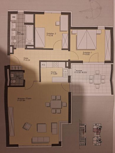 Die attraktive Wohnung besticht durch eine gut durchdachte Raumaufteilung mit einem großzügigen Wohnzimmer mit Küche und zwei Schlafzimmern, von denen ein Zimmer auch als Kinderzimmer oder Arbeitszimmer genutzt werden kann. Jeder Wohnraum verfügt über bodentiefe Fenster oder Terrassentüren und Oberlichter über allen Zimmertüren. Sowohl über das Wohnzimmer als auch über ein Schlafzimmer gelangt man auf die großzügige Terrasse, die nach Westen ausgerichtet und zum Teil überdacht ist. Hier können Sie den Tag ausklingen lassen und den Sonnenuntergang genießen.