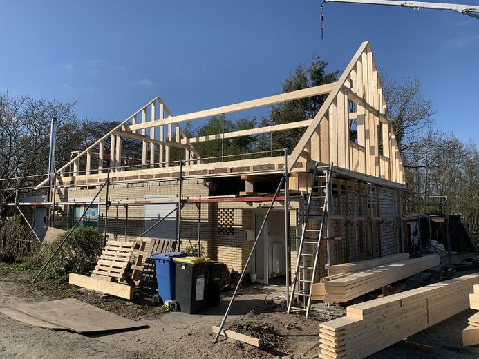 2022 wurde ein Satteldach auf das Haus aufgebaut (vorher Flachdach Bungalow, siehe letztes Foto)