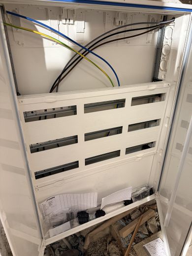 + Im DG neuer Hager-Schrank 3-reihig für Strom- und Lichtkreis Installation EG und DG. Alle 5x16mm2 Leitungen zu den Verteilern bereits UP / in Leerrohr verlegt und angeschlossen. Mehrere verlegte 50mm Leerrohre führen vom DG in den Technikraum im Kellergeschoss wo der Zählerschrank hängt. In dieser Etage kommt das unterirdische Kabel des Energieversorgers in das Haus.