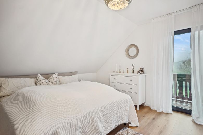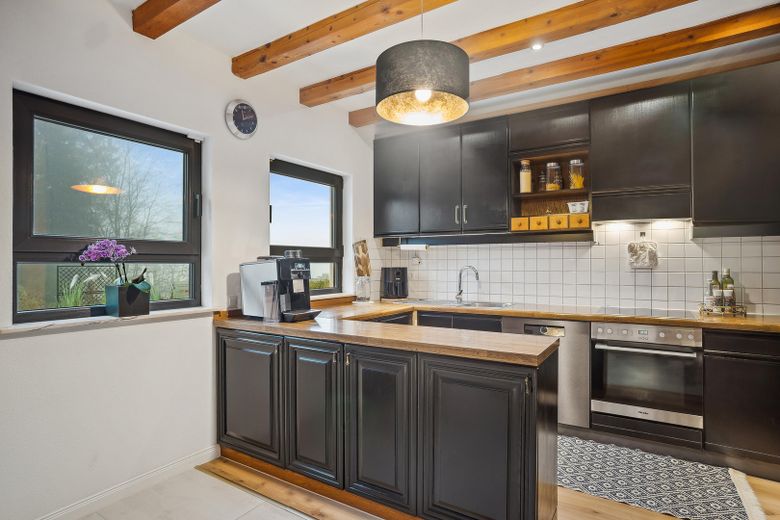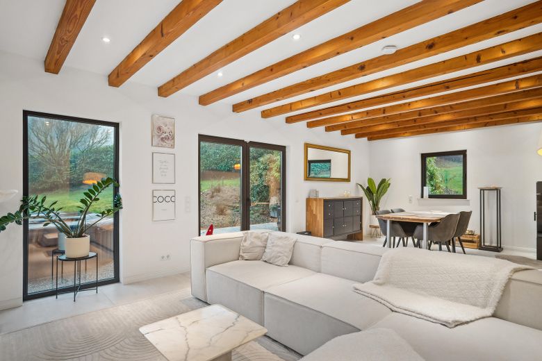 Im Inneren überzeugt das Haus durch helle Räume, eine offene Wohnküche mit Einbauküche, modernisierte Bäder sowie einen Kamin, der an kühleren Tagen für wohlige Wärme sorgt.