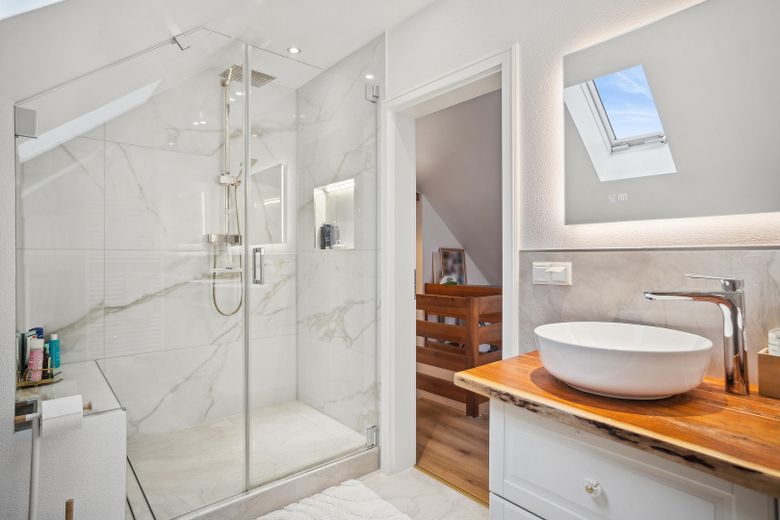 Der Wohnbereich wirkt einladend, hochwertig und ruhig – ein Ort, an dem man gerne ankommt. Ein besonderes Ausstattungsmerkmal ist der neu geschaffene Wellnessbereich mit Sauna im Untergeschoss.
