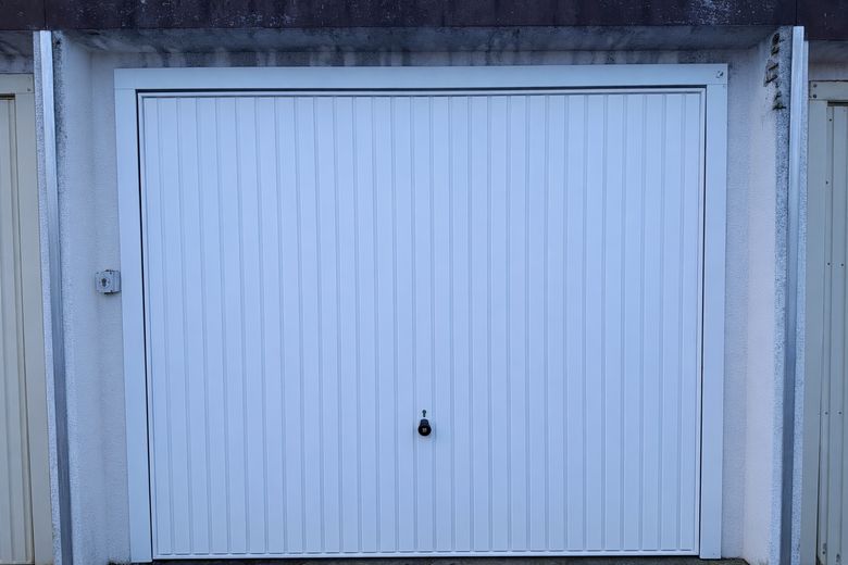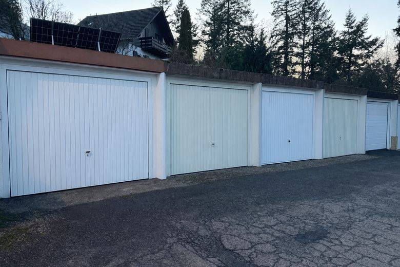Eine gegenüberliegende Garage mit elektrischem Tor gehört ebenfalls zum Angebot und rundet die Immobilie funktional ab.
