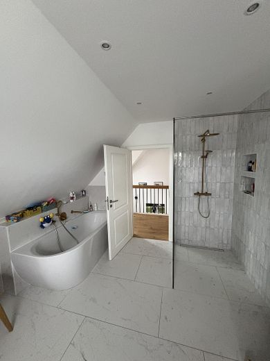 Das große Masterbad reizt durch die riesige begehbare Dusche, den Doppelwaschtisch, eine halb-freistehende Badewanne und den Wäscheabwurf zum HWR.