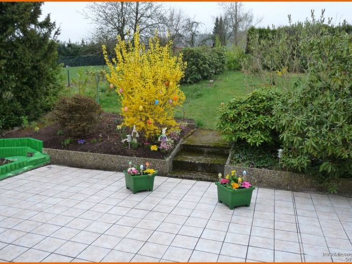 Die großzügige Terrasse muss einen neuen Belag erhalten, bietet aber mit dem sich anschließenden großzügigen und weitflächigen Garten eine wunderbare Ruheoase.