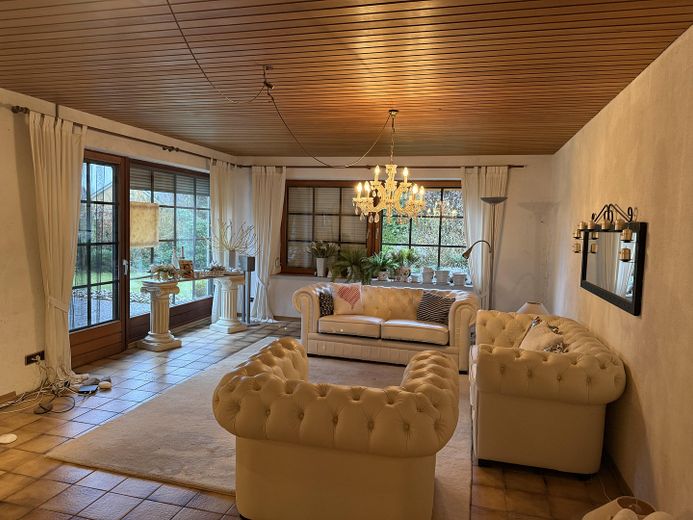 Dieses freistehende Einfamilienhaus bietet viel Platz für Familien und alle, die großzügiges Wohnen mit Garten und Terrasse schätzen. Das Erdgeschoss umfasst laut vorliegender Wohnflächenberechnung ca. 111.74 m². Hervorzuheben sind der großzügige Wohnbereich mit Kamin sowie die großen Fensterflächen mit Blick in den Garten und Zugang zur Terrasse. Zusätzlich ist im Erdgeschoss/unteren Wohnbereich eine Fußbodenheizung vorhanden. Die Küche ist separat angeordnet; Bad und Gäste-WC ergänzen das Raumangebot.