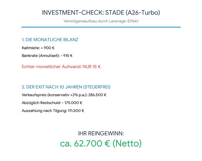 Das Fazit: Sie haben über 10 Jahre hinweg insgesamt nur 1.800 EUR "aus der eigenen Tasche" investiert (plus das Startkapital), um am Ende einen steuerfreien Gewinn von 62.700 EUR zu realisieren. Das ist die Kraft des Leverage-Effekts bei vermieteten Immobilien. Nutzen Sie das Zeitfenster vor der A26-Eröffnung! Diese Wohnung ist die perfekte Wahl für Anleger, die eine sichere Bank suchen. Möchten Sie das vollständige Exposé oder eine Besichtigung vereinbaren?