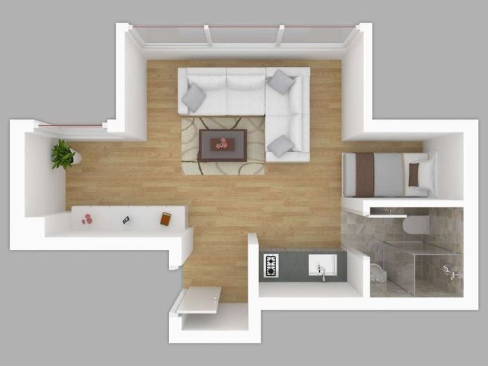 Das helle Apartment im Dachgeschoss verfügt über ca. 22 Quadratmetern Wohnfläche inklusive Einbauküche.Das Badezimmer ist mit einer Dusche ausgestattet.