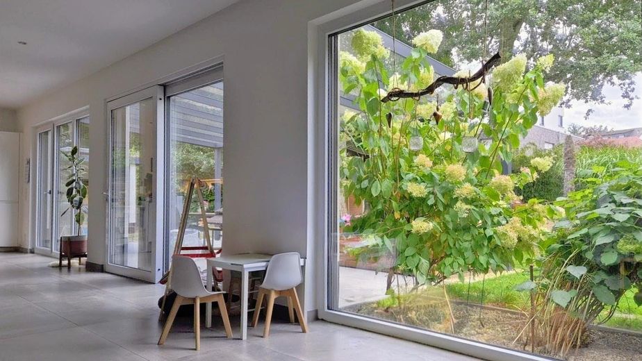 Der großzügige Wohn- und Essbereich mit hohen Decken schafft ein offenes, lichtdurchflutetes Raumgefühl und bildet den Mittelpunkt des Hauses. Hochwertige Bodenbeläge, eine moderne Einbauküche sowie eine Glas-Terrassenüberdachung unterstreichen den gepflegten und zeitgemäßen Wohnstandard.