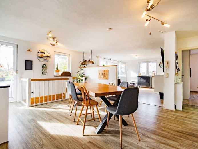 Die Wohnung erstreckt sich über das Erd- und Untergeschoss und wurde aus zwei Wohneinheiten zusammengeführt. So profitieren Sie von maximalem Raumgefühl und Flexibilität.