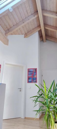 Im OG mit sichtbarem Dachstuhl befindet sich das geräumige Hauptbad mit Badewanne, Dusche, Bidet, WC und zwei Einzelwaschbecken. Zusätzlich ist separates WC vorhanden. Im Schlafzimmer sowie in den beiden großzügigen Kinder-/Arbeitszimmern lassen sich schöne Sonnenauf- oder -untergänge genießen.