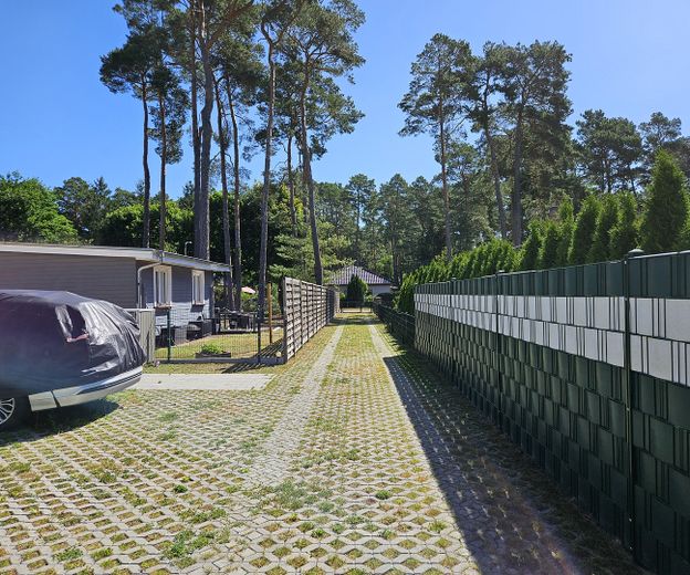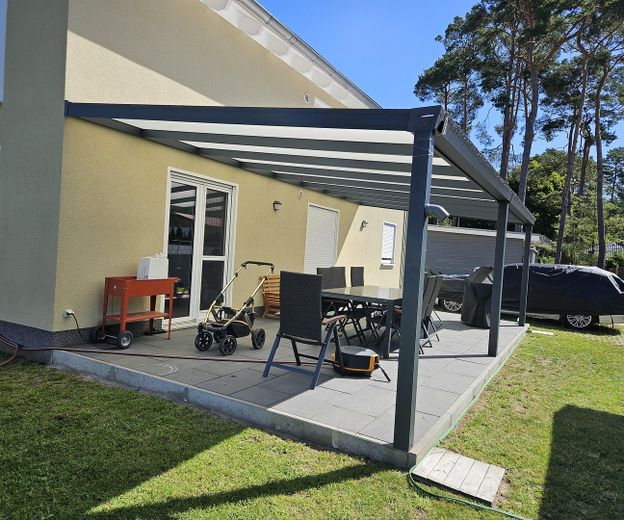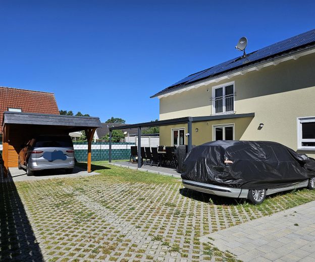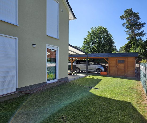 • Extra verstärktes Carport (für zusätzliche Solarmodule geeignet) mit Schuppen