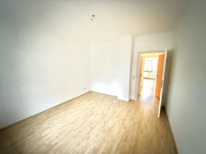 Die Wohnräume sind mit hellem Laminatboden ausgestattet, die Wände sind weiß gestrichen.