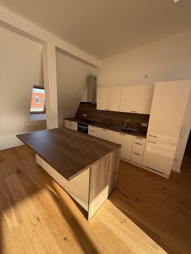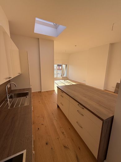 Herzstück der Wohnung ist das helle, großzügige Wohnzimmer mit integrierter, voll ausgestatteter Wohnküche. Der offene Grundriss, die großen Fensterflächen sowie die angenehme Raumhöhe schaffen ein modernes und sehr lichtdurchflutetes Wohnambiente. Vom Wohnbereich aus gelangen Sie direkt auf die sonnige Dachterrasse, die einen idealen Rückzugsort im Freien bietet.