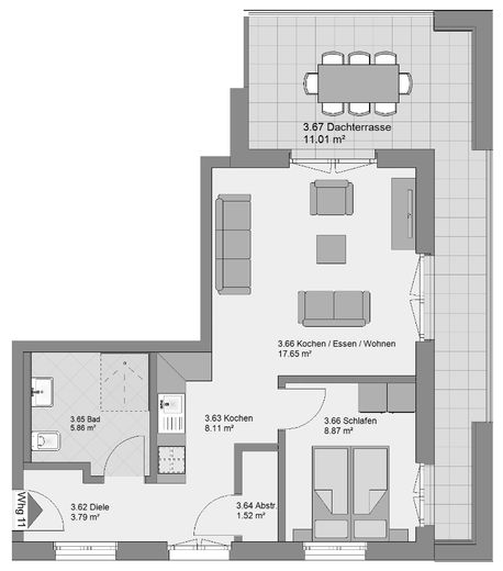 Ein Ort zum Ankommen und Aufatmen: Wohnung 11 im Staffelgeschoss bietet Ihnen ein besonderes Wohngefühl mit viel Licht, Luft und Raum. Die großzügige Dachterrasse macht diese 2-Zimmer-Wohnung zu einem echten Juwel.