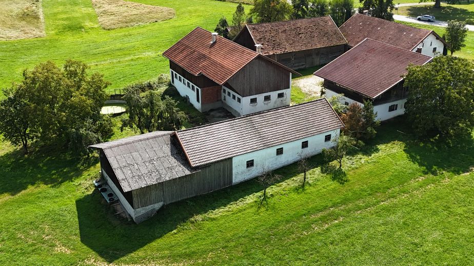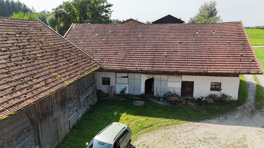 Das Gebäudeensemble umfasst neben dem Wohnhaus eine landwirtschaftliche Scheune (Stadel) und weitere Nebengebäude. Die Gesamtgröße des Grundstücks beträgt 19.865 m² und bietet vielfältige Nutzungsmöglichkeiten, beispielsweise Gartenbau, Tierhaltung oder ruhiges Wohnen mit großzügigen Freiflächen. Durch die Südausrichtung des Wohnhauses sowie die offene Lage inmitten von Wiesen und Feldern entsteht eine helle, ruhige und naturnahe Wohnatmosphäre.