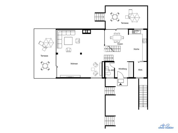 Die DHH zeichnet sich durch eine offene Split-Level-Bauweise aus. Im Erdgeschoss befindet sich ein großes Wohnzimmer sowie eine große offene Küche mit Essecke. Angrenzend ist eine Terrasse nach Süden sowie eine Terrasse nach Westen. Das Obergeschoss hat an zwei Seiten Balkone, das Schlafzimmer und die 3 Kinderzimmer haben jeweils einen Zugang zum Balkon. Das Schlafzimmer hat angrenzend ein eigenes Badezimmer, ein weiteres Badezimmer ist für die Kinder vorhanden. Jeder Raum hat bodentiefe Fenster.