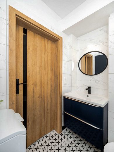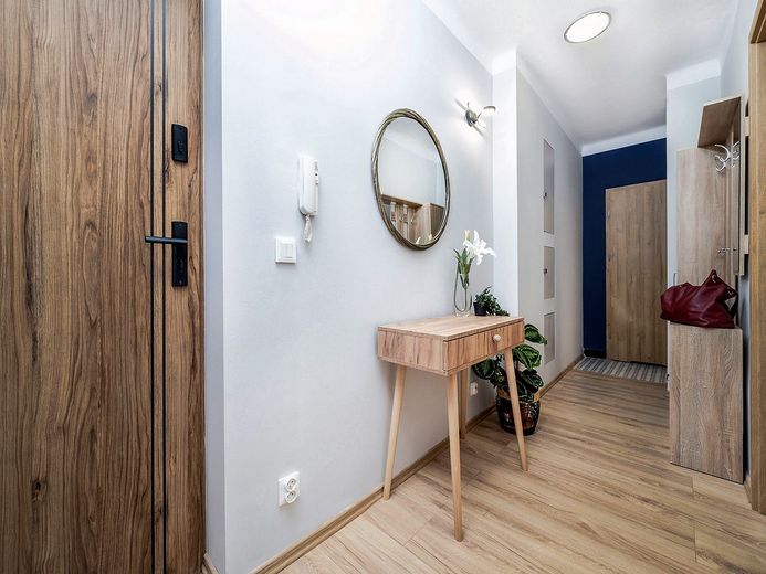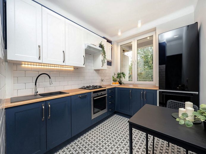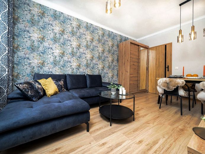 Eine moderne 2-Zimmer-Wohnung nach der allgemeinen Renovierung mit neuen Möbeln.