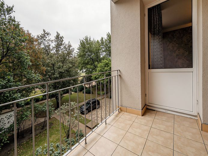 Die Räumlichkeiten bestehen aus einer Küche, Wohnzimmer, Schlafzimmer, Bad und Flur. Zusätzlich gibt es einen Zugang zum Balkon vom Wohnzimmer aus. Die Wohnung ist sehr ruhig gelegen. Der Balkon und alle Fenster blicken auf eine weitläufige, eingezäunte Grünfläche mit zahlreichen alten Bäumen. Durch die Süd-Ost-Ausrichtung der Fenster sind die Räumlichkeiten sehr gut belichtet.