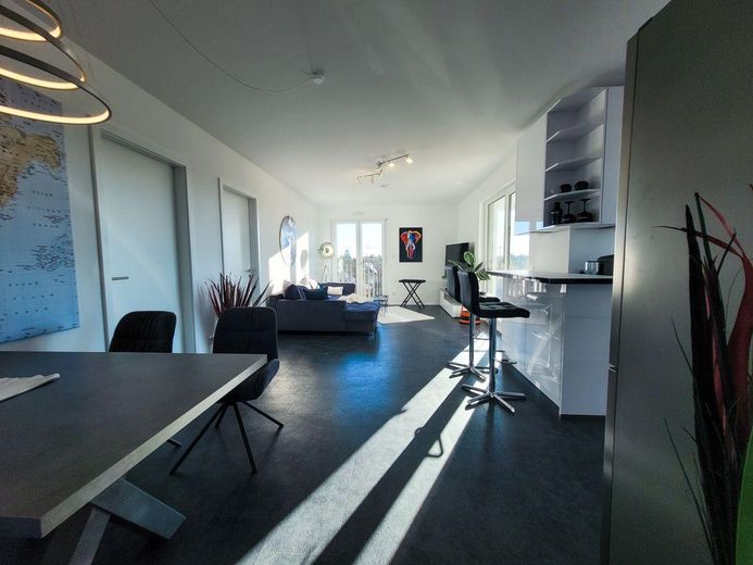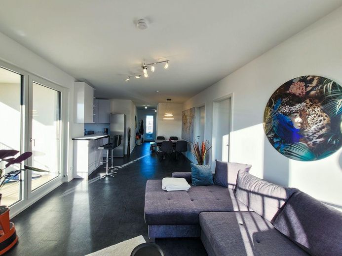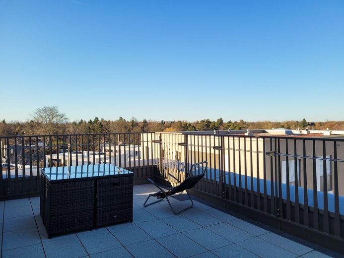 Die Wohnung wurde modern mit neuen Möbeln ausgestattet. Sie besticht durch ihre Helligkeit mit ihrer Ost/Süd/Westausrichtung. Auf beiden Dachterrassen kann man einen unverbaubaren Blick ins Grüne bis in die Alpen genießen.
