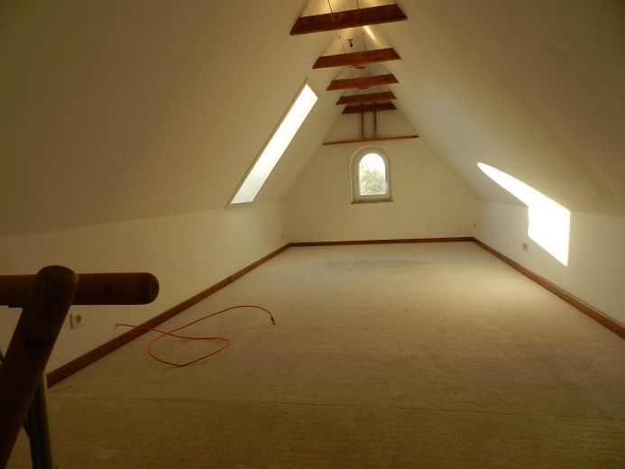 Der Spitzboden des Hauses ist zweigeteilt. Der eine Teil dient als Speicher. Der größere Teil ist als Ruheraum ausgebaut.