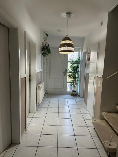 Der Hauseingang vorne führt in den großzügigen Flur. Von diesem gehen die Küche, der Hauswirtschaftsraum mit Seiteneingang zum Carport, das helle Wohn- und Esszimmer mit großen Fenstern zur Terrasse und Garten, sowie ein weiterer Abstellraum und das Gäste WC mit Fenster ab.