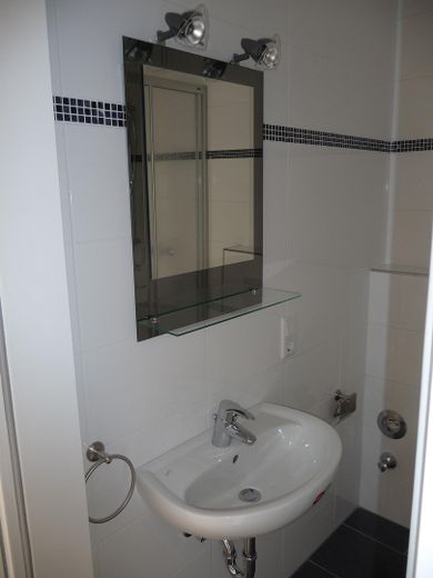 Ein modernes Duschbad mit Spiegelfläche und fester Duschabtrennung rundet das Bild ab.