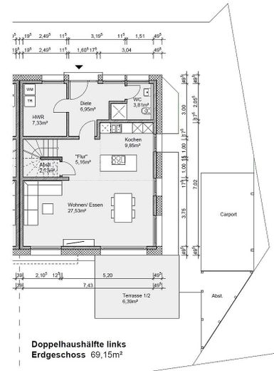 Die DHH wird außen komplettiert mit einem stylischen Wing- Carport, einem weiteren PKW- Abstellplatz davor und einem separaten Abstellraum für Fahrräder und Gartengeräte.