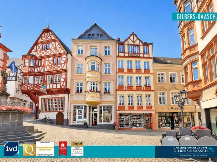Zum Verkauf steht dieses repräsentative, um 1900 erbaute 5-geschossige Café-/Wohnhaus in bester Lage, direkt am Marktplatz, des beliebten Moselstädtchens Bernkastel-Kues.