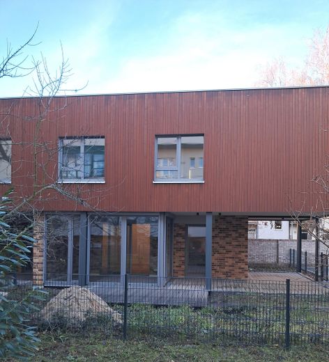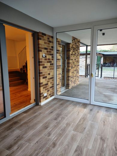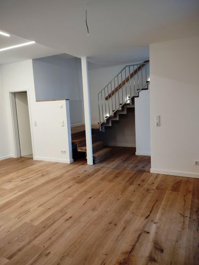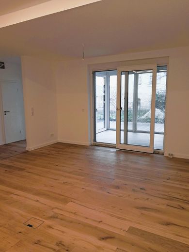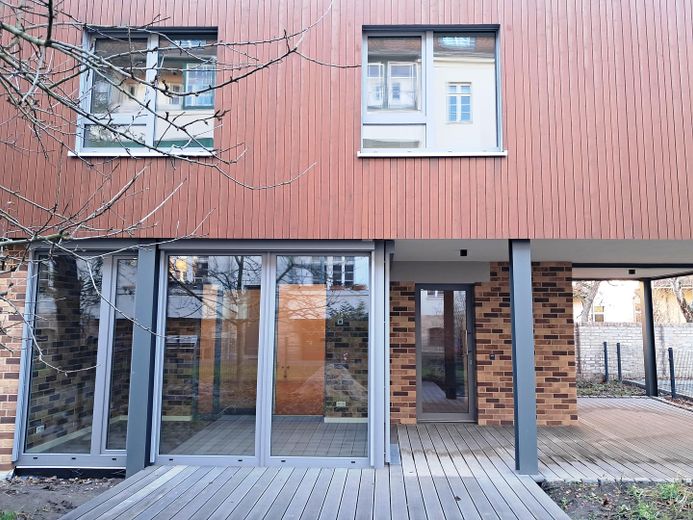 Das rechte Haus (WE 25) erstreckt sich über zwei Etagen: Im Gartengeschoss befindet sich der offene Wohn- und Essbereich mit vorinstallierten Küchenanschlüssen. Daran schließt sich der hochwertige Wintergarten an, ausgestattet mit Fußbodenheizung und allen Medienanschlüssen. Über den Wintergarten gelangt man über 2 Möglichkeiten zu Terrasse und Garten. Der Garten wird mit Rasen und Hecke bepflanzt. Ein Obstbaum und eine Magnolie stehen bereits.