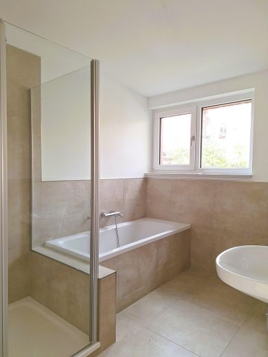 Im Obergeschoss befinden sich die beiden Schlafzimmer, ein modernes Fensterbad mit Badewanne und Dusche, sowie ein Hauswirtschaftsraum mit Anschluss für Waschmaschine und Trockner und weiteren Verstauungsmöglichkeiten