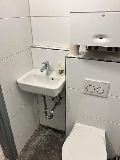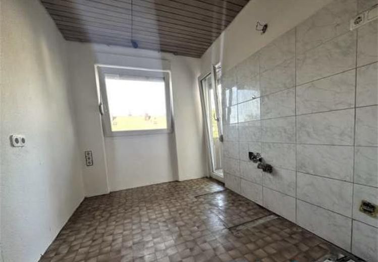 Die Küche befindet sich mitten in der Wohnung und hat einen Zugang zum Balkon. Das Tageslichtbad besteht aus einer begehbaren Dusche, einem Waschbecken und einem WC.