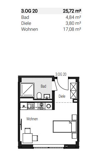 Diese hochwertig ausgestattete, voll möblierte 1-Zimmer-Neubauwohnung im Erdgeschoss überzeugt mit durchdachtem Grundriss auf ca. 25,72 m² Wohnfläche und einer eigenen Terrasse – ideal für Singles oder Pendler.