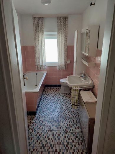 - Badezimmer mit Badewanne, Waschtisch, WC und Fenster