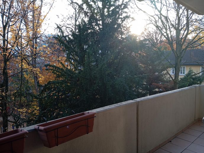 Der Balkon öffnet sich zum begrünten, ruhigen kleinem Spielplatz — ein echtes Privileg in dieser urbanen Lage. Der Balkon ist sowohl vom Wohnbereich als auch vom Schlafzimmer zugänglich.