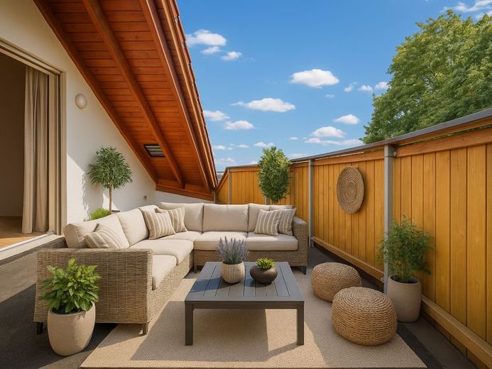 Dachgeschoss (2. OG): Das gemütliche Schlafzimmer mit Zugang zur nicht einsehbaren und großzügigen Dachterrasse rundet das Angebot ab. Hier genießen Sie ruhige Abende, Sonne und Privatsphäre. Auf derselben Ebene befindet sich ein großer, begehbarer Dachbodenraum mit normaler Tür – ideal als Stauraum oder Hobbyfläche.