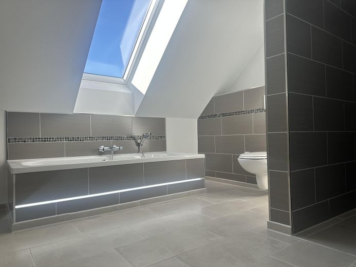 - Badezimmer: Zwei moderne Badezimmer mit stilvollen Fliesen, eines mit Dusche, das andere im Obergeschoss mit Dusche und einer einladenden Badewanne für entspannte Stunden