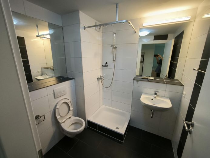 - Modernes Bad mit großem Spiegel, Waschbecken, WC, Dusche.