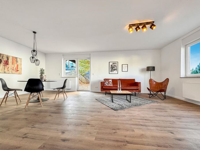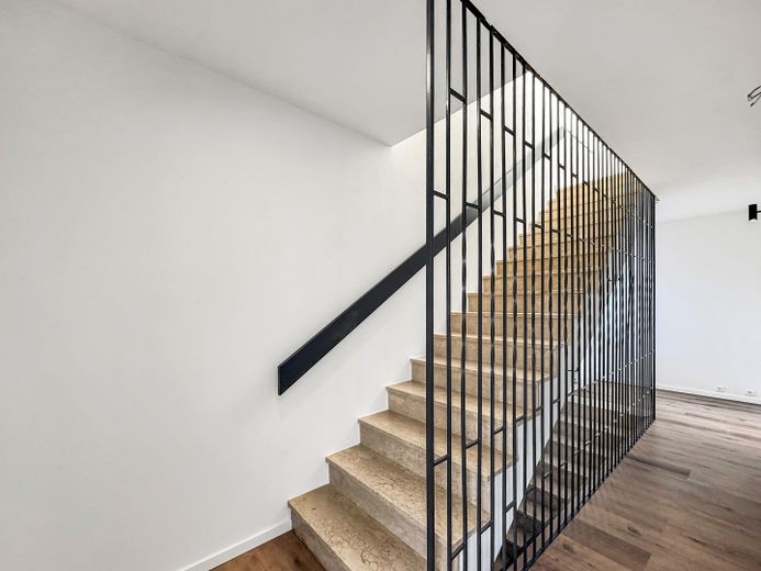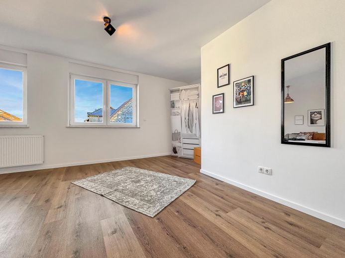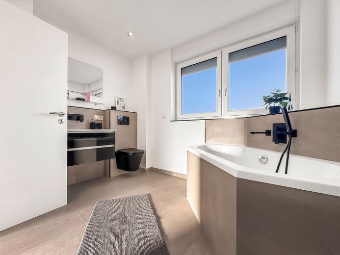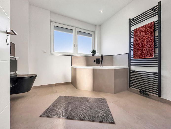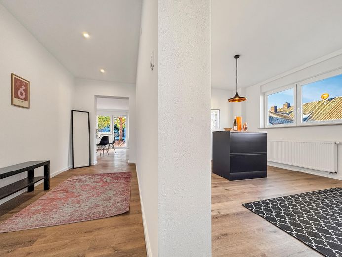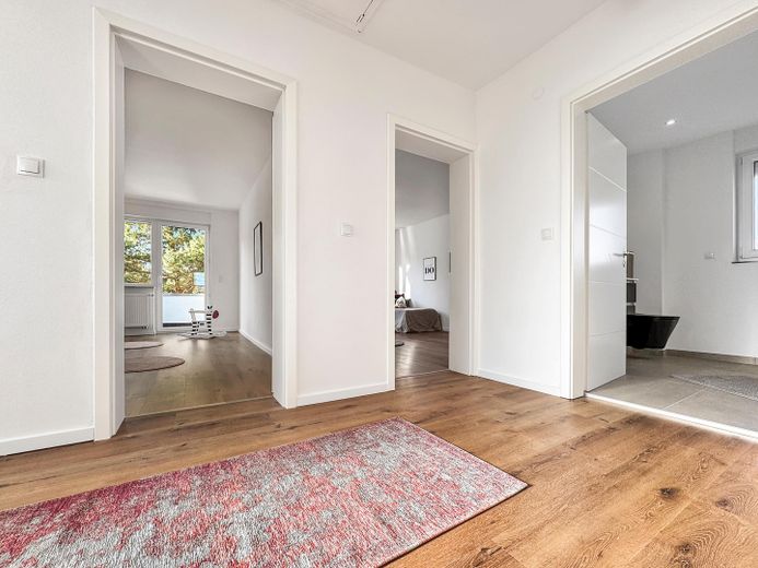 Das im Jahr 2025 renovierte Haus bietet, neben seinem großzügigen und modernen Grundriss mit insgesamt drei Schlafzimmern und zwei Bädern, viele weitere Annehmlichkeiten: wie die neuen Isolierglasfenster mit elektrischen Rollläden, eine A++ Luftwärmepumpe der neuesten Generation für Heizung und Wasseraufbereitung, eindrucksvolle Badezimmer, eine große Dachterrasse sowie eine Garage mit davor liegenden zwei Stellplätzen. Ein unausgebauter Keller mit separatem Eingang, welcher vom neuen Eigentümer zusätzlich zu Wohnzwecken ausgebaut werden könnte, ist ebenfalls vorhanden. Die hellen und zugleich stilvollen mit hochwertigen Materialien gestalteten Räume runden diese Immobilie ab.