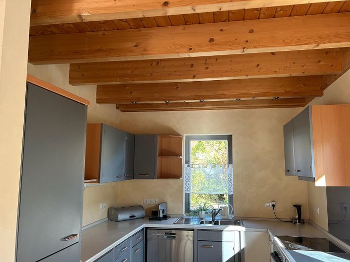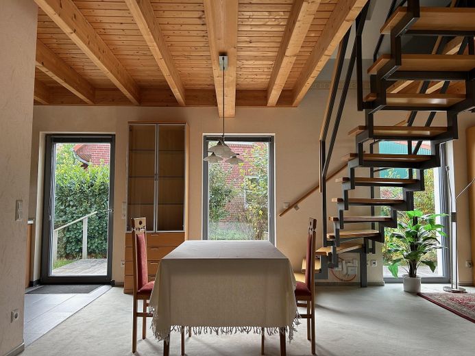 Das gesamte Erdgeschoß vermittelt ein sehr angenehmes Raum- und Akustikgefühl durch die naturbelassene Holzdecke. Dadurch herrscht eine ausgesprochen behagliche Wohlfühlatmosphäre.