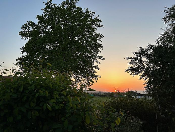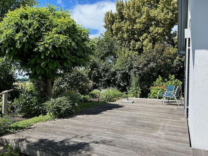 Das eingewachsene Grundstück bietet eine gute Privatsphäre. Die großzügige Terrasse liegt in Süd-Westausrichtung. Wunderschön sind die Sonnenuntergänge über dem Deister.
