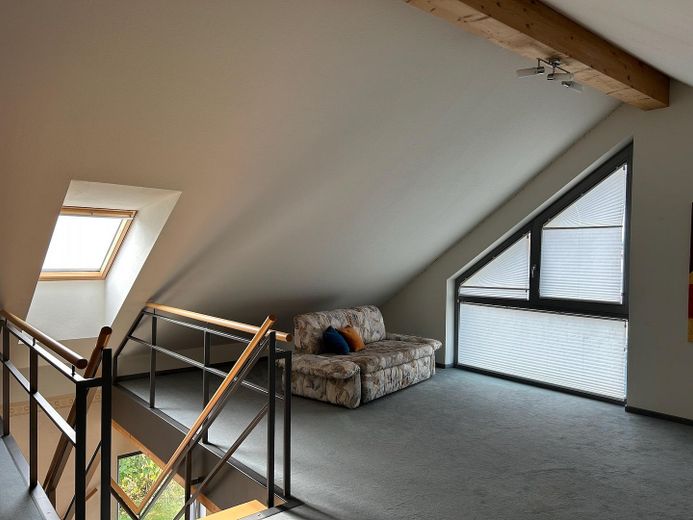 Eine handgefertigte Metall-/Holztreppe führt zum oberen Geschoss in einen großzügigen offenen Studiobereich. Ein separates Zimmer schließt sich an.