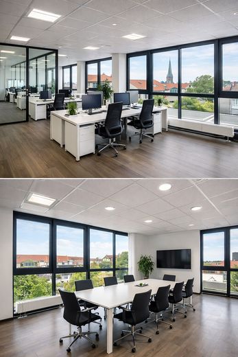 Die Büroeinheit erstreckt sich über zwei Etagen mit jeweils ca. 750 qm, die über ein zentrales Treppenhaus sowie einen Aufzug komfortabel erschlossen sind. Die Flächen bieten eine ideale Kombination aus Einzelbüros, großzügigen Besprechungsräumen, offenen Arbeitsbereichen sowie funktionalen Nebenflächen wie Teeküchen, Archiv und Technikräumen.