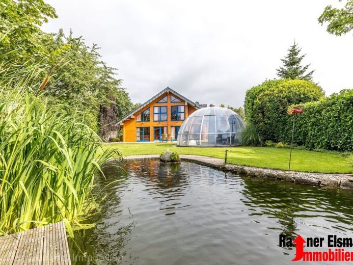 Die parkähnliche Gartenlandschaft fügt sich harmonisch an das Naturholzhaus an und setzt sich über einen ebenerdigen Übergang nahtlos in den Naturgarten fort. Der bewusst geschwungen gestaltete Garten bildet einen reizvollen Kontrast zur klaren, geometrischen Architektur des Blockhauses. Ein idyllischer Teich mit angrenzendem Gartenhaus sowie ein Iglu, bestehend aus drei Elementen, welches komplette geschlossen werden kann, vervollständigen dieses außergewöhnliche Ensemble.