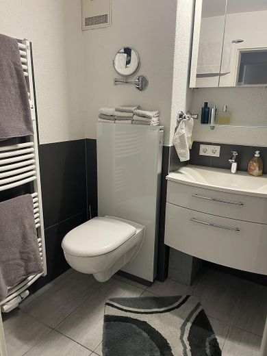 Zur Wohnung gehören zwei Garagen und ein Aussenstellplatz, zwei Kellerabteile, sowie ein großer Hobbykeller (48 qm) bestehend aus zwei abgetrennten Räumen und einem Duschbad mit WC.