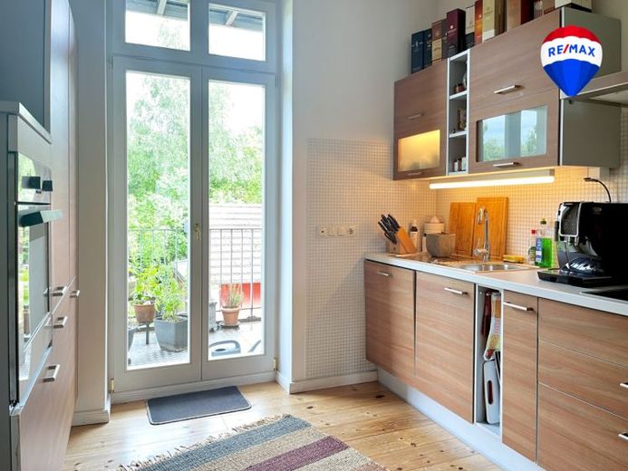 Zum Verkauf steht die 99 m² große Wohnung im 1. Obergeschoss. Sie besticht durch hohe Decken (2,85 m), eine durchdachte Raumaufteilung mit drei Zimmern, einer großzügigen Wohnküche, sowie einem stilvoll ausgestatteten Bad. Zwei Balkone bieten Sonne zu jeder Tageszeit. Originale Landhausdielen, Glasmosaikfliesen in Bad und WC, ein eigenes Kellerabteil (ca. 10 m²), sowie ein optionaler Carport-Stellplatz (13.000 €) runden das Angebot ab.