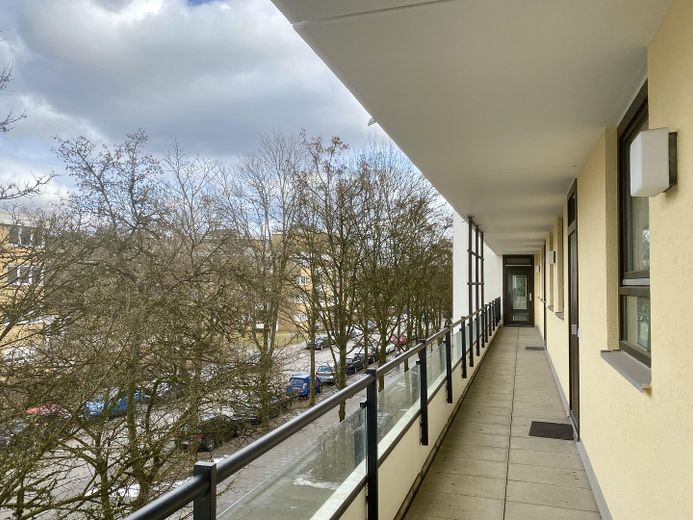 Die Wohnung im 2. Stock erreichen Sie per Aufzug und über einen Laubengang. Der Eingang zur Wohnung selbst befindet sich in einem weiteren Treppenhaus. Wohnzimmer und Schlafzimmer liegen auf der Seite des großzügigen, begrünten Innenhofes. Der 12 qm Süd-Balkon ist sowohl vom Wohnzimmer als auch vom Schlafzimmer aus begehbar. Die Küche mit bereits vorhandener Einbauküche ist groß genug für eine Sitzgruppe und im Bad mit Badewanne ist Platz für eine Waschmaschine. Zur Wohnung gehört ein abgeschlossenes Kellerabteil.